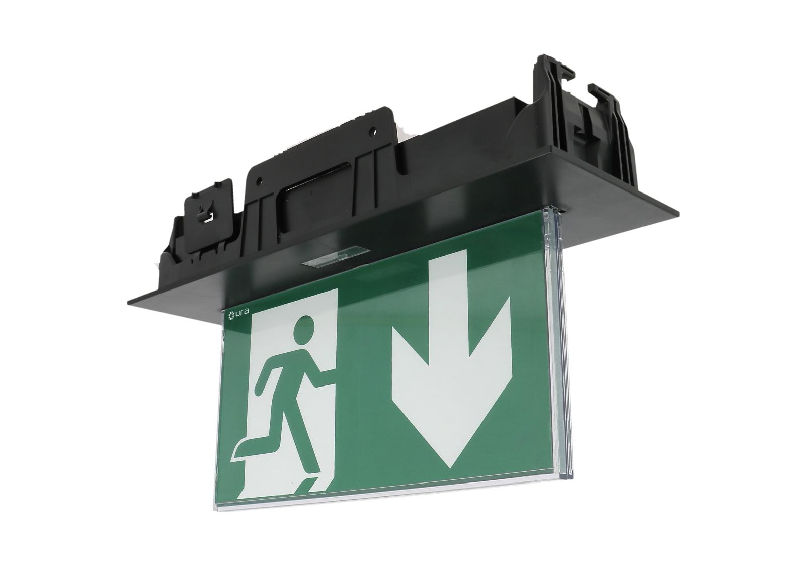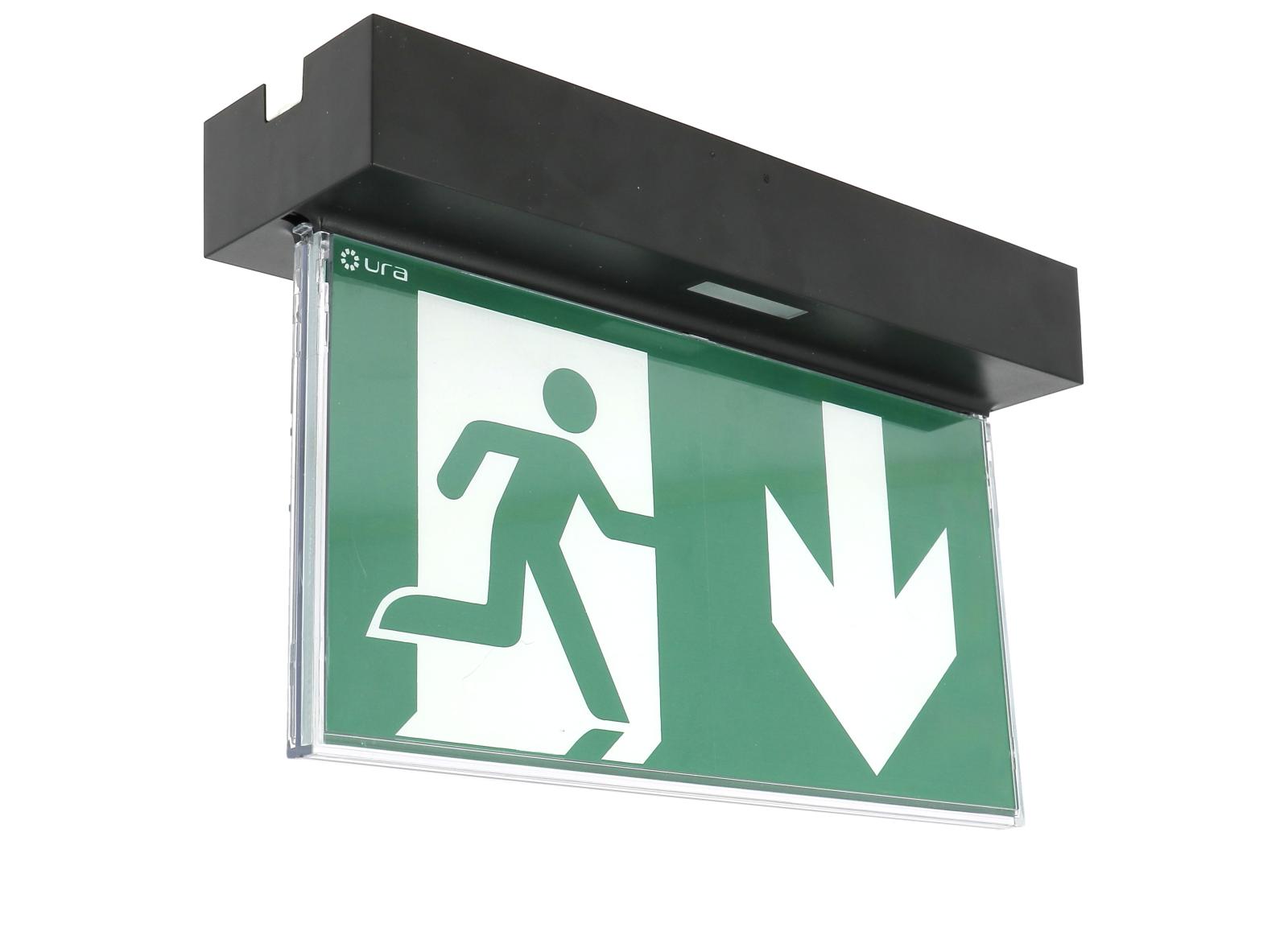 Un Design Noir parfaitement intégré, réduit à sa simple fonction avec un pictogramme d'évacuation lumineux sans bordure éclairé uniformément