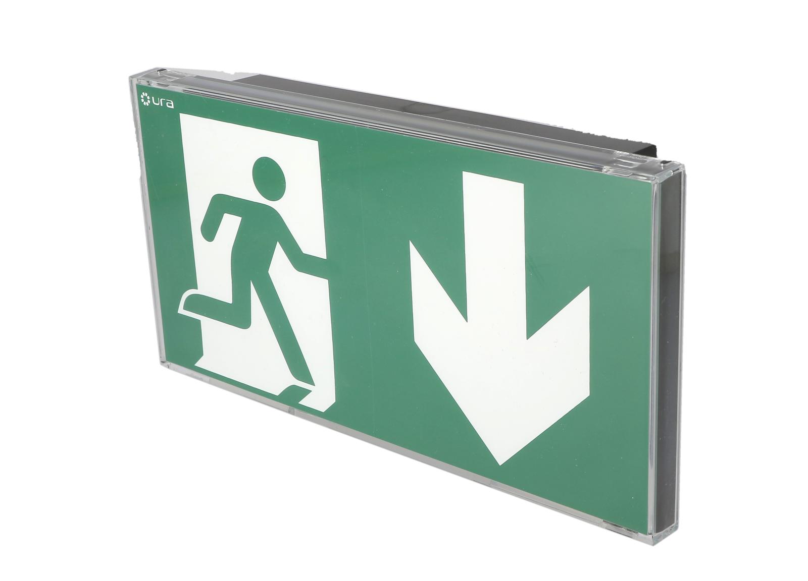Un Design Noir parfaitement intégré, réduit à sa simple fonction avec un pictogramme d'évacuation lumineux sans bordure éclairé uniformément