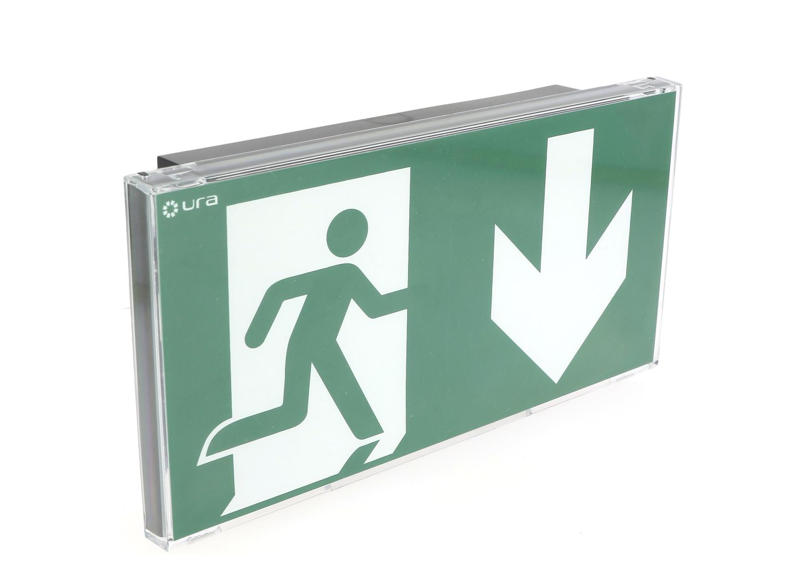 Un Design Noir parfaitement intégré, réduit à sa simple fonction avec un pictogramme d'évacuation lumineux sans bordure éclairé uniformément